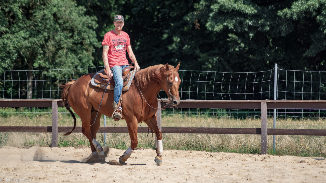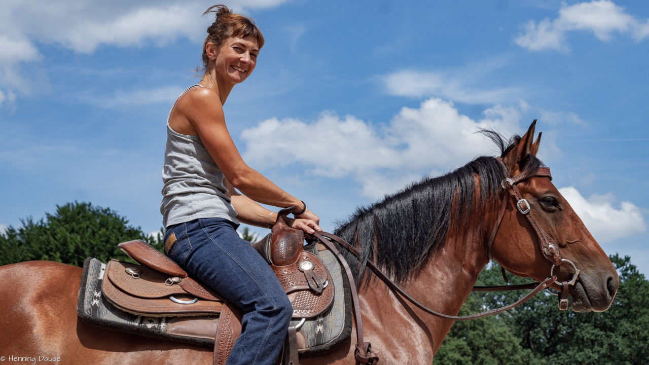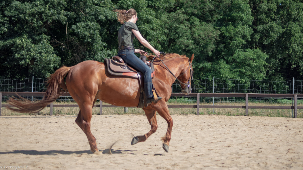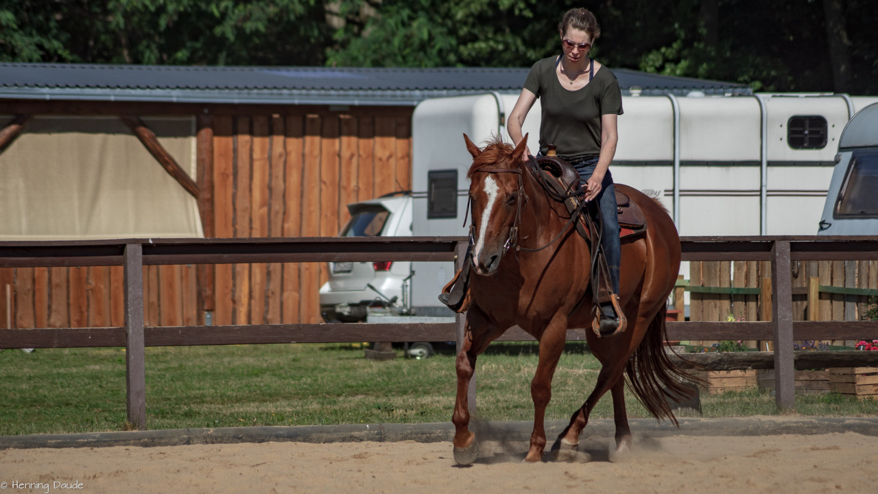 Gute Aussichten auf die Sommer-Kurs-Saison 2018: Siebenschläfer haben wir bei der „Banti-Cow Ranch“ bei knapp 30°C hinter uns gebracht, sodass die ausstehenden Outdoor-Kurse im Juli und August wohl ebenfalls bei strahlender Sonne stattfinden werden. Selbst bei diesen sommerlich-warmen Temperaturen ließen wir den nahegelegenen See links liegen und machten uns u.a. daran, den Takt herzustellen, Pirouetten zu verfeinern, fliegende Wechsel zu verbessern, Spins zu optimieren, Übergänge kontrolliert zu reiten sowie bei leckerem Essen und viel Spaß dem Motto „Innen- und Außengalopp leichtgemacht!“ gerecht zu werden.