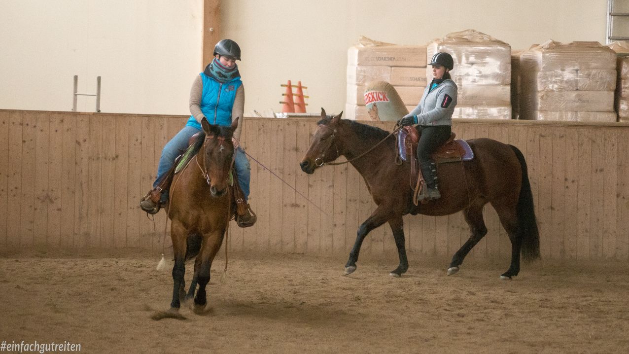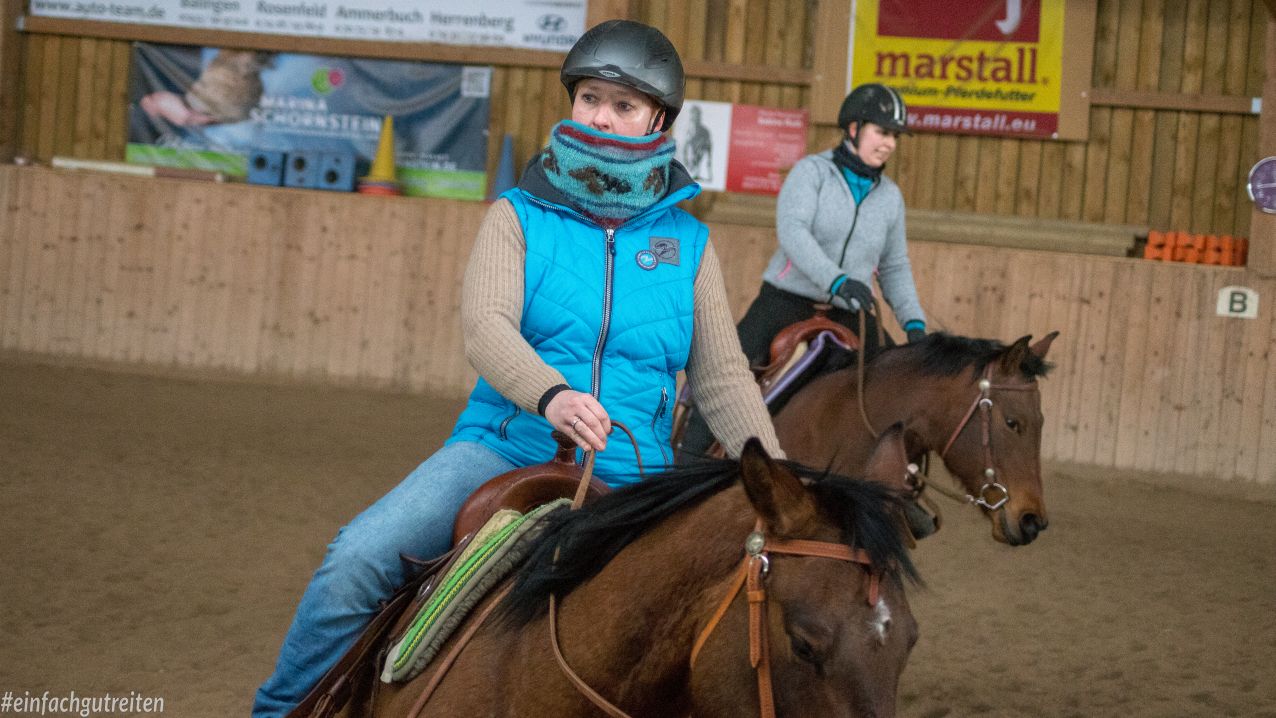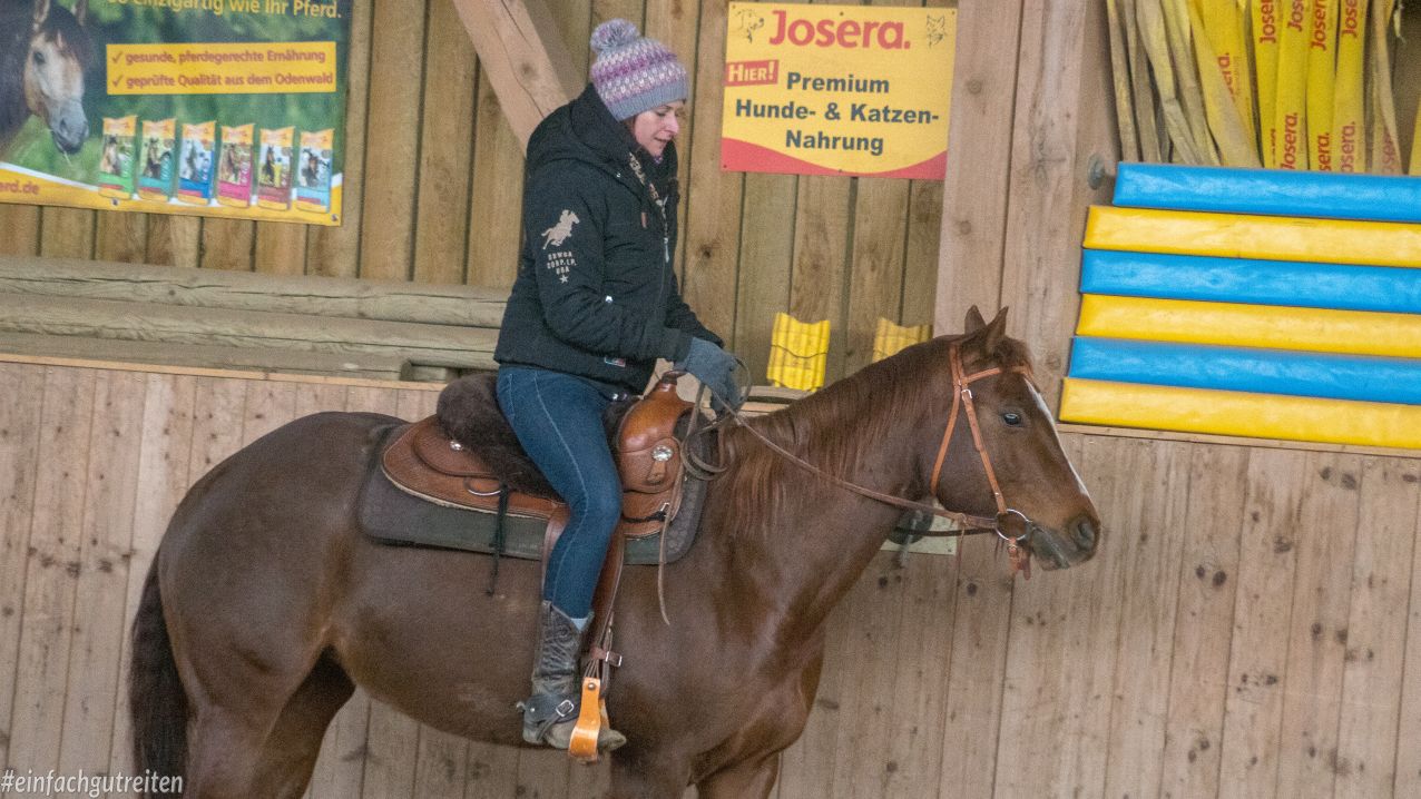 Bei immer noch zweistelligen Minusgraden ging es weiter durch BaWü zu „Trail Rider“ am Schwarzwald. Viele neue Gesichter, auch einige aus der Schweiz erwarteten mich dort gemeinsam mit Quartern, Ponys, Norwegern, Halb-Arabern und natürlich den über den Winter chronisch unterbeschäftigtem Sir Henry. Übergänge und Balance-Verbesserung standen auf dem Stundenplan. Wie bekomme ich einen ruhigeren Schritt? Welche Übungen helfen mir, den richtigen Galopp zu finden?
